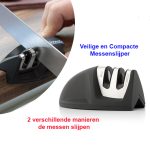 - De messenslijper is zeer klein en compact. Je kan hier letterlijk alle keukenmessen mee slijpen